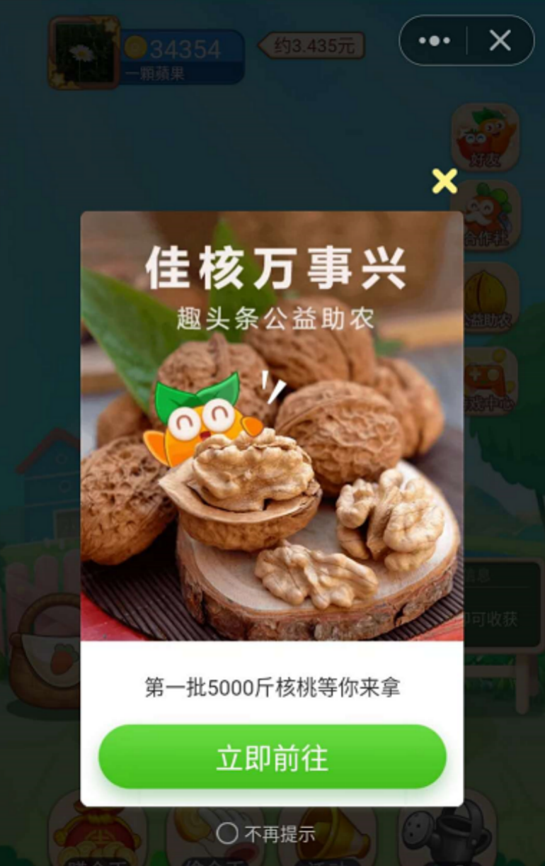 在每天打卡趣头条的“趣种菜”游戏里,吴女士发现了一个“佳核万事兴”公益助农活动,只要坚持在游戏中“种核桃”,收获“爱心”,就能帮助云南省楚雄州武定县的农民提高当地特产核桃的销量。吴女士每天起床第一件事就是去“种核桃”,还发动了身边很多姐妹一起参加。