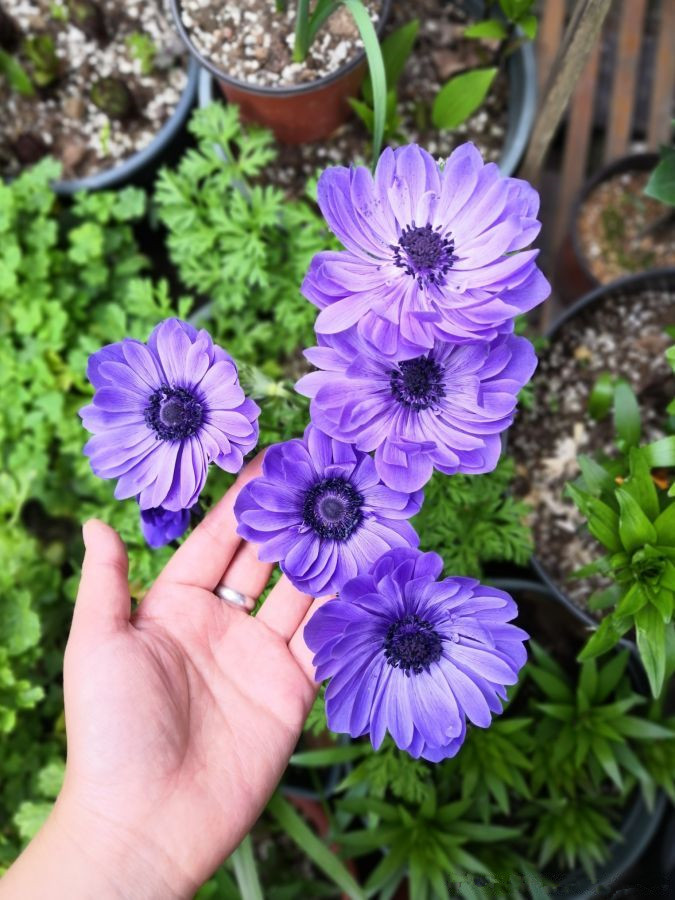 银莲花和著名的“草花牡丹”花毛茛是近亲,形态很相似,叶子都和芹菜有点像,花型多样,多为半重瓣,花瓣排练整齐,层次感分明,花色丰富,有红色、紫色、白色等,可做鲜切花,被广泛用于室内及庭院装饰,是花卉交易市场上的香饽饽。