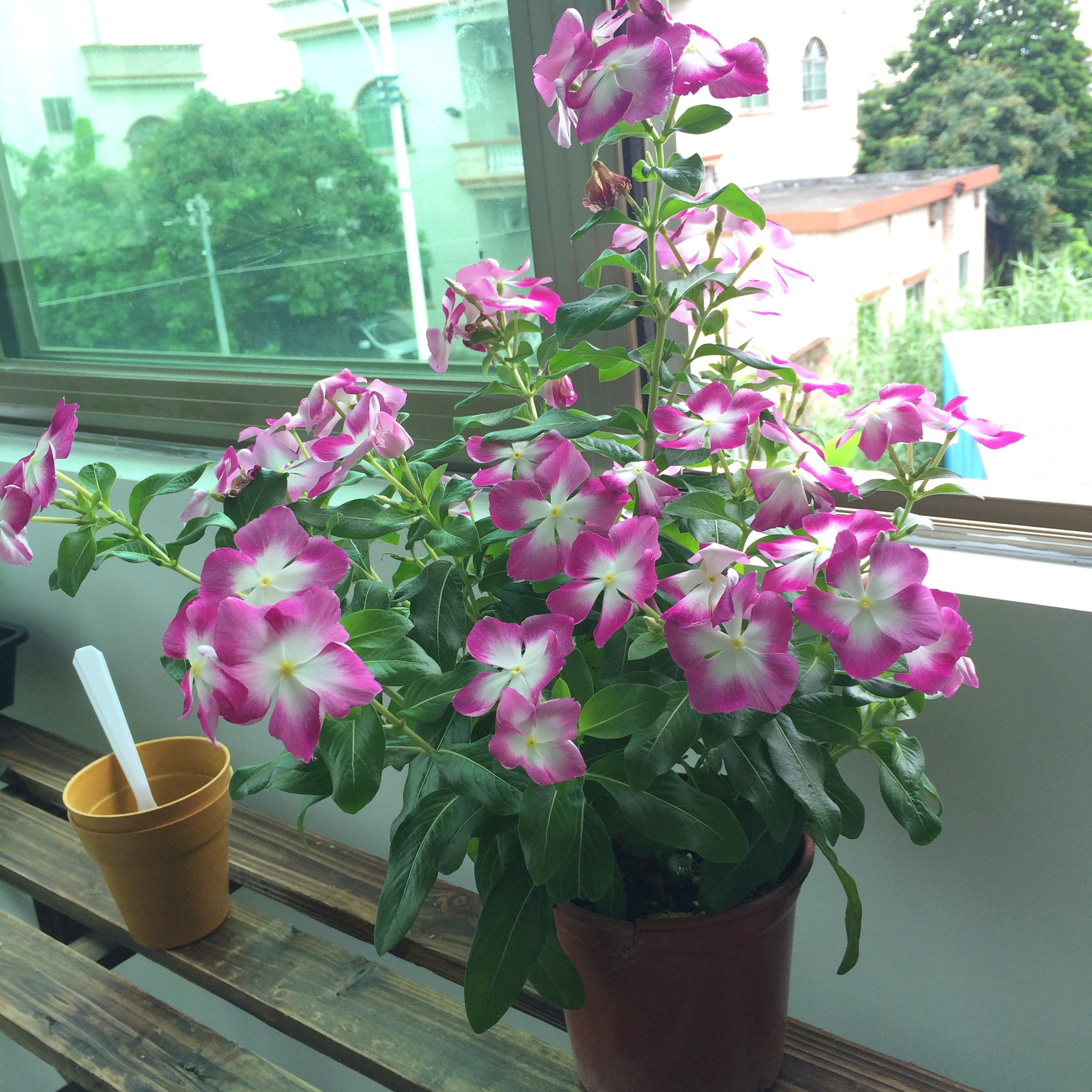 这种花我们这叫“五叶梅”,学名长春花,夹竹桃科植物多年生亚灌木(不是草本),枝条木质化,高度可达60公分,叶色翠绿油亮,花色绚丽多彩,是南方常见的绿化带美化植物,也是很受欢迎的家庭盆花。