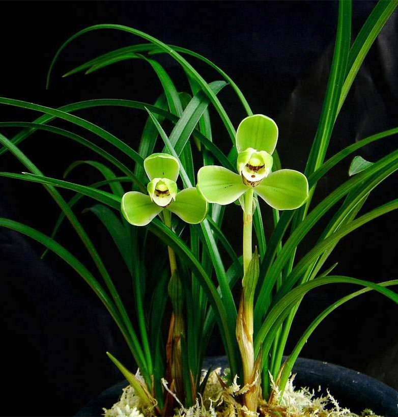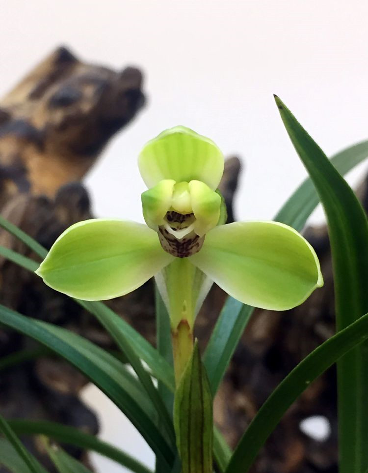 它的花型外三瓣收根放角,非常的工整,花开翠绿色,花葶又高又直,有一种出架的感觉,它的叶片全部弯曲如弓,丝毫不显杂乱,反而多了几分充盈之美,一盆4苗,上盆后更漂亮,因为春兰本来就显单薄,所以苗数越多越美。