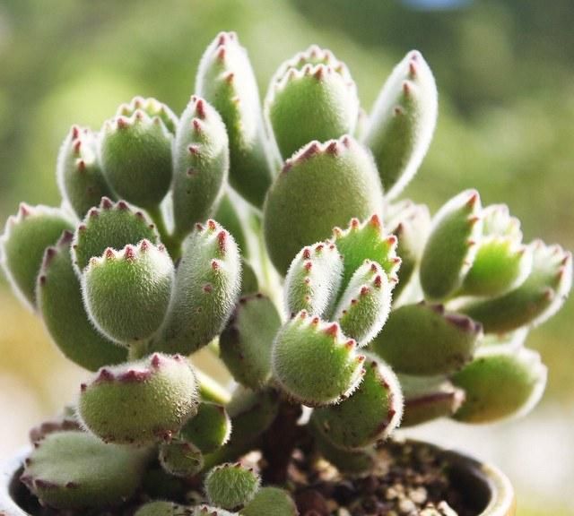熊童子喜欢充足的阳光,在阳光充足的,温差大一些的环境中,熊童子的爪状齿上,会变成红褐色,在这种情况下,熊童子会更加可爱,萌萌的。到了夏季高温的时候,尤其是35度以上的时候,就需要适当遮阴,因为这个时候的熊童子处于休眠状态,如果阳光太过强烈,容易出现晒伤叶片的情况。