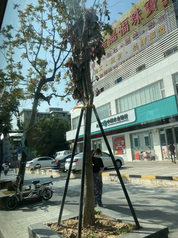 以上两图为翠竹路金嘉福珠宝大厦路段枯死的行道树。市民建议:移栽树木也要注意养护