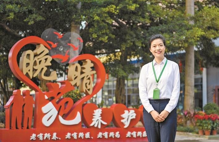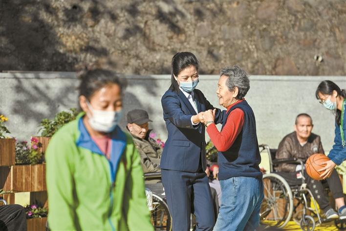 2月5日,在深圳龙华区晚晴苑养护院,徐岩岩在户外与老人互动。