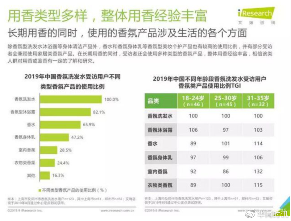 “香氛”被誉为品质男女的第二种衣服,每人身上独特的味道,既放松心情愉悦自我,又体现出一个人的品位、审美和生活状态,提升社交自信。随着新一代消费群体的崛起,香氛这类能满足悦己心理和仪式感,并体现个性化表达的产品,普及到追求精致、便捷生活的现代男女,2019年的市场调研就已显示香氛洗发水使用率甚至达到100%。