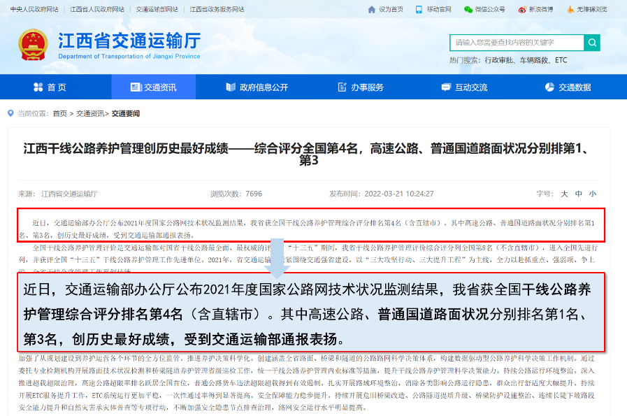 过去,养路云科技以江西省为起点,在江西省公路事业发展中心、江西省智慧交通运输事务中心、江西省公路工程检测中心、宜春市公路事业发展中心、上饶市公路事业发展中心、吉安市公路事业发展中心、抚州市公路事业发展中心等单位应用,在江西省应用于超3000座桥梁,10万公里路面的检测养护当中,利用强大的计算机数据处理能力及专业的公路行业分析能力,助力江西省在2021年度国家公路网技术状况监测评价中,获全国干线公路养护管理综合评分排名第4名。其中,高速公路、普通国道路面状况分别排名第1名、第3名,创历史最好成绩!受到交通运输部通报表扬。