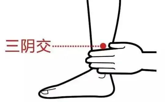 三阴交取穴法:三阴交穴在小腿内侧,脚内踝骨的最高点往上三寸处(自己的手横着放,约四根手指横着的宽度),左右各一穴。