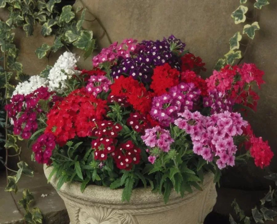 春季种下去的美女樱盆栽,在夏天就能花开灿烂。它的枝条在土面上匍匐生长,就会形成一大片,养护的时候每天要注意有6~8小时以上的直射光,在春夏季节,要经过合理的修剪,花后及时补充肥料,就能保证开花更多。
