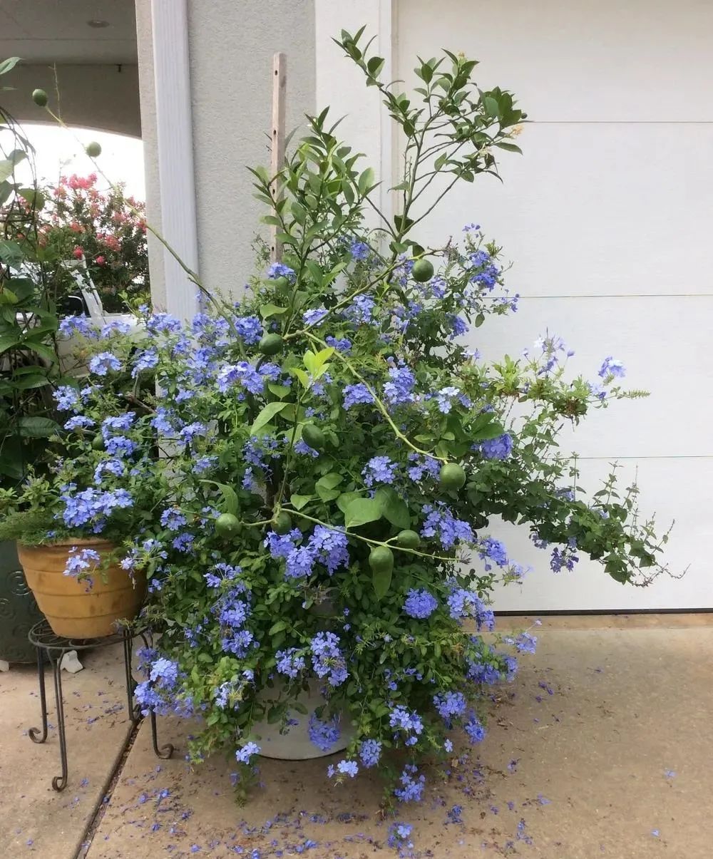 但也有很多朋友会说,蓝花丹在夏天的时候哦,植株会长得特别散乱,其实就是没有注意给它搭成支架,枝条长得太长了,也没有注意修剪,它的枝条长高了,一定要在花盆里立好支架,最好是网格状的,让它的枝条攀附在支架上生长。