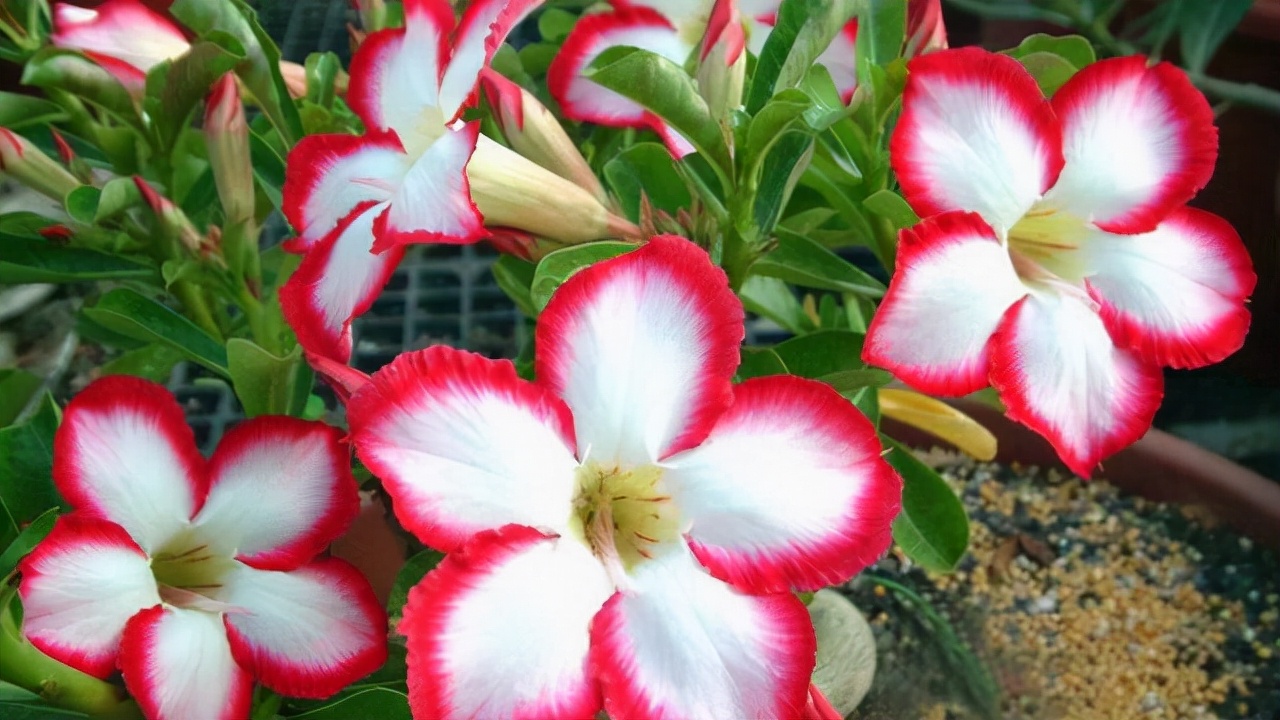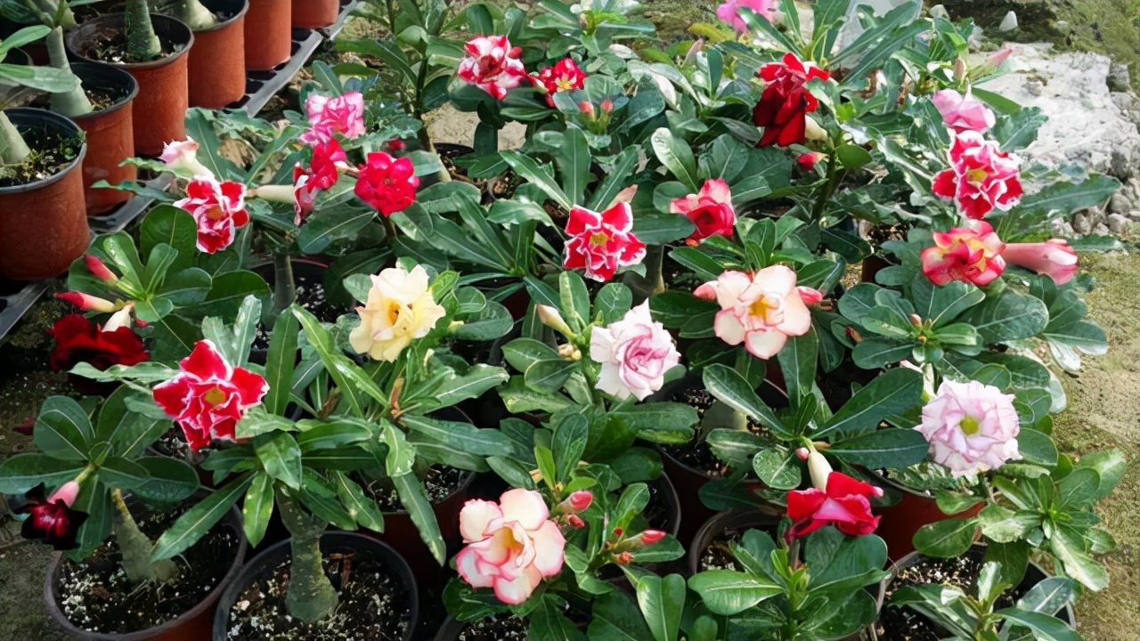要是把沙漠玫瑰按照花型和花色进行细分的话,那品种就太多了,具体多少种还真没统计过,但常见的就有百多种,都是开花漂亮,花期长,还能爆花的优质品种,像青花瓷,大富贵,黄馨,红妆,红楼梦,清新,闪电,新娘等等,这里就不一一的罗列名字了,沙漠玫瑰经过这些年的人工繁育,品种是越来越多,尤其是各种重瓣花型层出不穷,虽然没有单瓣的能够爆花,但是真的好漂亮。