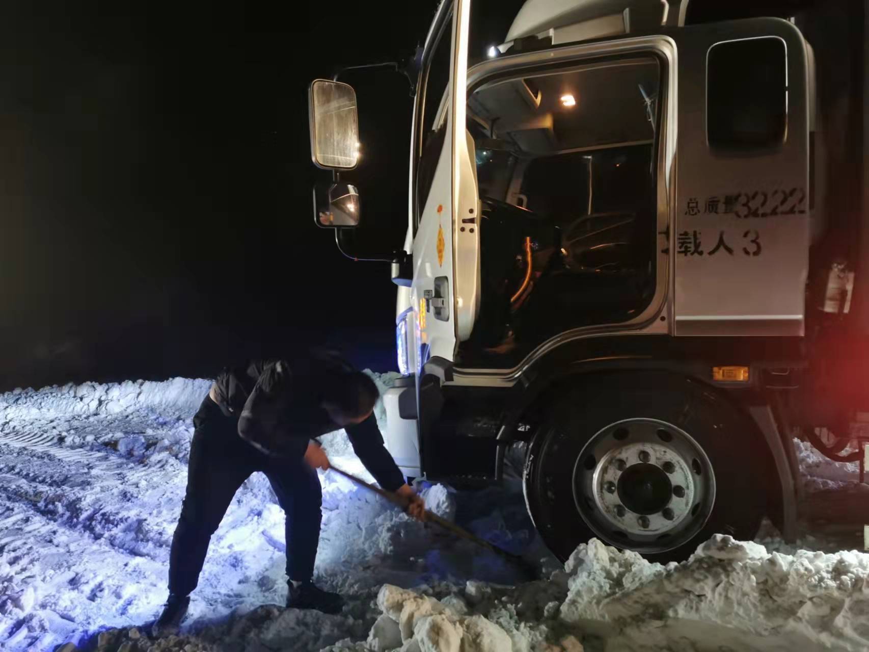 零下二十来度的低温,锡林浩特公路养护中心主任王树和救援人员们马上拿出救援方案:用装载机铲雪开道,在大货车车轮下撒融雪剂,再用装载机助推被困车辆。