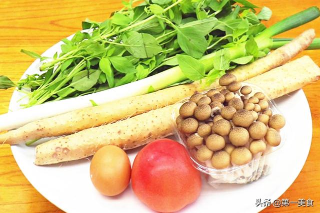 1.首先,我们把山药削净外皮,用白醋洗净上面的黏液,然后洗干净切成小块放入盆中,加入少许食盐增加底味,撒上适量的面粉拌匀,面粉薄薄的一层就可以了,太多了影响口感;蟹味菇把根切掉洗干净;番茄去蒂切成小块;再准备一把提味增香的荆菜,把叶片掐下来,洗净备用。