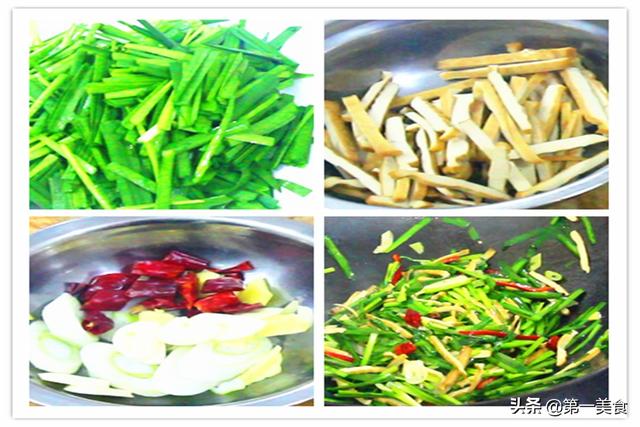 1.首先,我们把韭菜摘洗干净、切成段;半个红椒切成细丝,有青有红配色比较好看;几片香干切成条;大葱切成马蹄片,生姜切成菱形片,大蒜切成薄片放在一起,再抓入一小把红干椒备用。