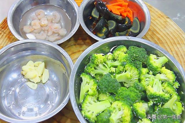 1.首先,我们把西蓝花去除根柄,切成小块放入清水中,加入一勺食盐浸泡十分钟,西蓝花的花心比较密,泡泡能洗得更干净;适量的鲜虾仁清洗一下;皮蛋两个,切成小块放在盆中,胡萝卜半根,切成菱形片与皮蛋放在一起;再切点蒜片备用。