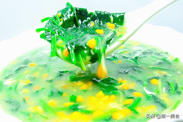 3.锅内烧少许油,油热以后倒入葱姜和胡萝卜粒炒出香味,加入适量的清水,放入食盐2克调底味,煮至汤汁沸腾放入玉米粒,用勺子搅拌打去浮沫,继续煮4到5分钟,玉米粒煮熟以后加入鸡粉2克,勾入半勺水淀粉增加汤汁的粘稠度,继续用勺子不停的搅动,避免粘锅糊底,汤汁再次沸腾以后放入菠菜,起锅之前撒上一把虾米,搅匀后美味即成。