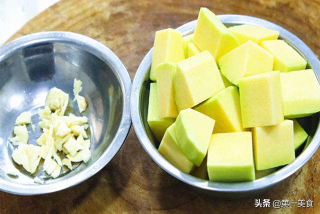 1.首先,我们准备嫩南瓜一段,削净外皮,切成均匀小块;大蒜几粒,拍散后切成蒜末。