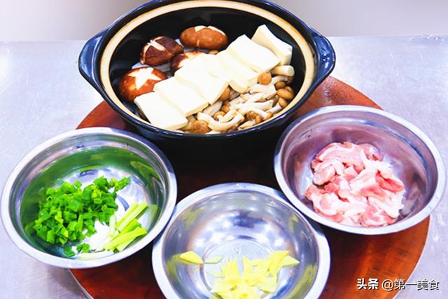 1.首先,我们来看一下今天所需要的食材:几朵香菇、一块嫩豆腐、一把蟹味菇和一小块五花肉。蟹味菇切去根部,放入清水中洗干净;豆腐用开水浸泡一下去除豆腥味,然后取出来切成片;香菇去柄、洗干净,在上面打上十字花刀;五花肉去除肉皮切成薄片;生姜切成菱形片,小葱洗干净、把葱头切成段,葱叶切成葱花备用。