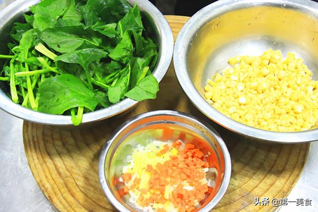1.首先,我们准备一根鲜嫩的水果玉米,把玉米粒切下来,清洗干净;菠菜也择一下干净;大葱切成葱花,生姜切成姜丝,再切点胡萝卜丁放在一起搭配颜色。