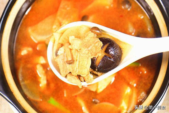 4.然后连汤带肉一起盛放在砂锅里面,大火煮至沸腾后转为小火焖煮8分钟,让食材的鲜香味融入到汤里面。8分钟以后放入小葱段稍微烫一下,闻到葱香味以后淋入芝麻香油、撒上葱花美味即成。