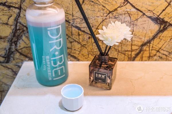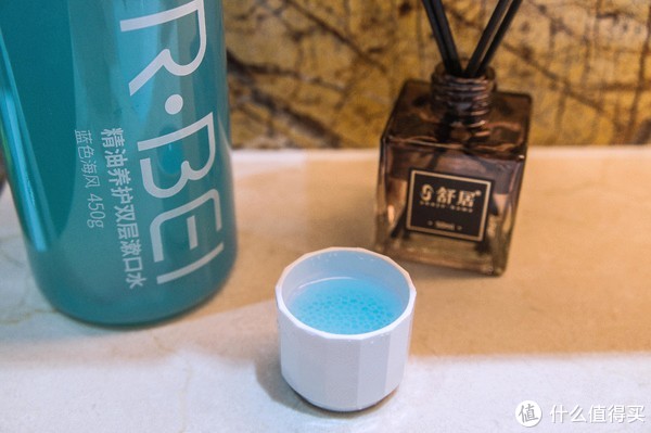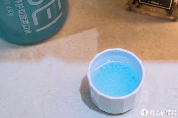 根据产品介绍,使用前对产品进行了均匀摇晃,淡粉色的精油层会和淡蓝色漱口水短暂融合,这时就可以倒出瓶盖使用,为了便于观察,我用了白色的瓶盖方便展示。