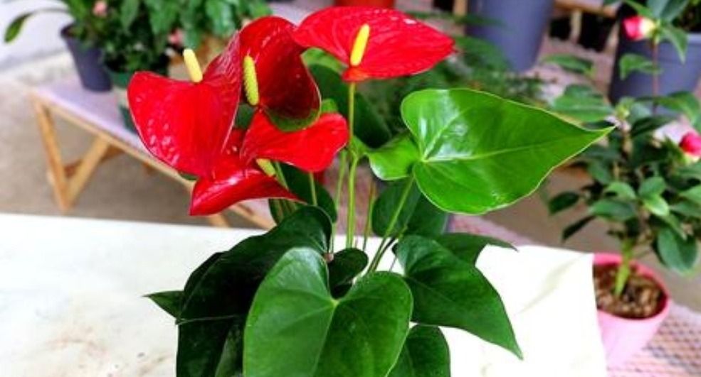 红掌和一帆风顺长得有点相似,但是红掌开花要更加鲜艳喜庆,而且它的叶子油绿有光泽,这种花生长也不需要太多的阳光,反而是很怕强光直晒,放在阳光下容易晒伤花朵和嫩叶。红掌除了怕强光直晒以外,也很怕水涝,在日常养护的时候,也不要频繁去为它浇水,不然容易造成叶子发黄,根系腐烂等情况。在植株生长旺季,可以多给它补充一些磷钾肥,把它放在有弱光的地方去养护,就能让它尽快去开花。