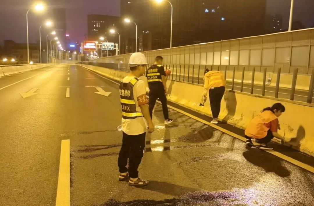 中安在线、中安新闻客户端讯9月8日,记者从合肥市市政工程管理处获悉,因长期风吹日晒雨淋,加之汽车尾气侵蚀,南北高架桥防撞墙涂装自然老化损坏严重,该处夜间对其进行重新涂装。