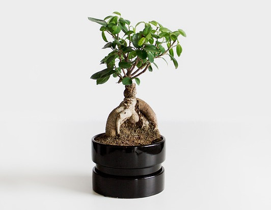 盆的形状、大小、色泽须和树体相配。一般情况下,高深筒盆,适合于悬崖式;椭圆或浅长方形盆,宜栽直干或斜干式;圆形盆可配置低矮盘曲的植物;多角形浅盆,宜栽高干式。
