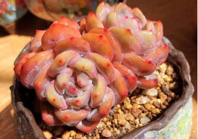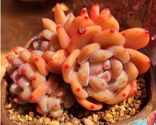 雪天使从不挑盆,不管是素盆,花盆都可以接受,形状也无所谓,圆的方的都没有问题。但是不同于其他的多肉,养护雪天使的时候,建议选个有大盆面的。因为这种多肉的长势非常凶猛,爆发力太强,盆小了施展不开。