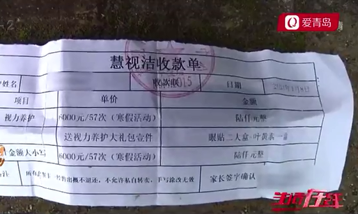 为了能让外孙晚一点戴眼镜,张女士的母亲便花3800元,办了一张视力养护卡。30多次的项目做完以后,今年1月8日,她再次花6000元买了57次的视力养护项目。