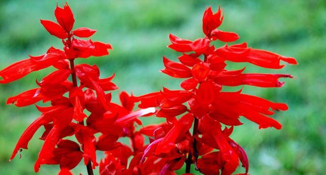一串红 一串红花如其名,花色是十分艳丽的红色,纯度非常高,夏季花开最为旺盛,喜欢夏季炎热的温度和气候,但是这种花不耐寒冷,秋季的时候可以把它的种子收集起来,春天来了再播种到土地里面去。