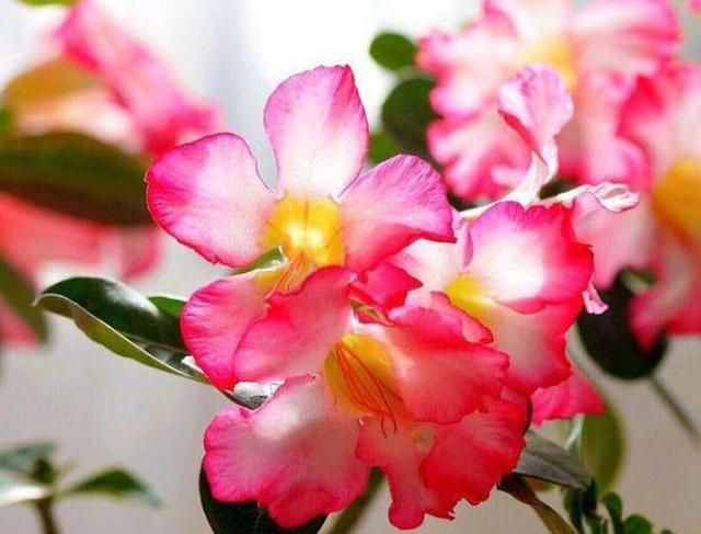 沙漠玫瑰 沙漠玫瑰是一种比较耐旱的花,主干和根系能够存储大量的水分,一个月浇一次水就可以了,沙漠玫瑰的花色丰富,并且开花能力也十分强大,只要温度、阳光、水分充足,一年四季就可以花开不断。